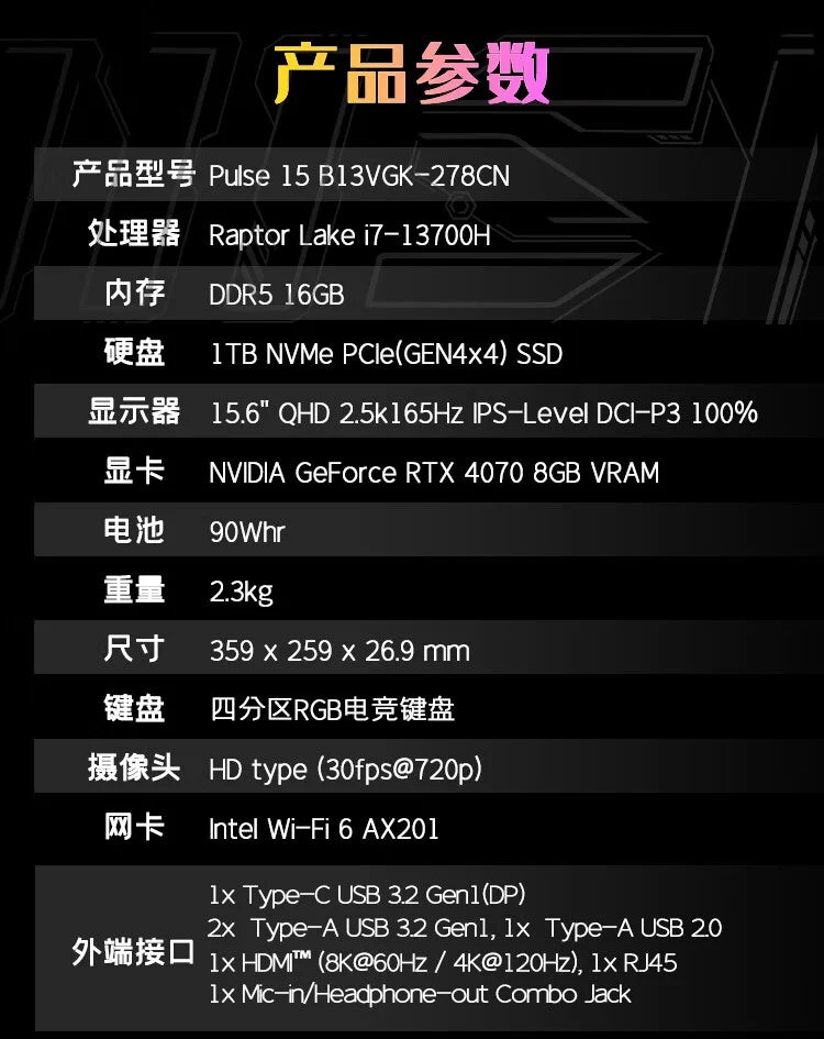 2024 New MSI Pulse15 15.6-Inch High-Performance Esports Laptop 13th Gen I7-13700h Full Blood RTX4070 16GB 1TB 2.5K 165Hz