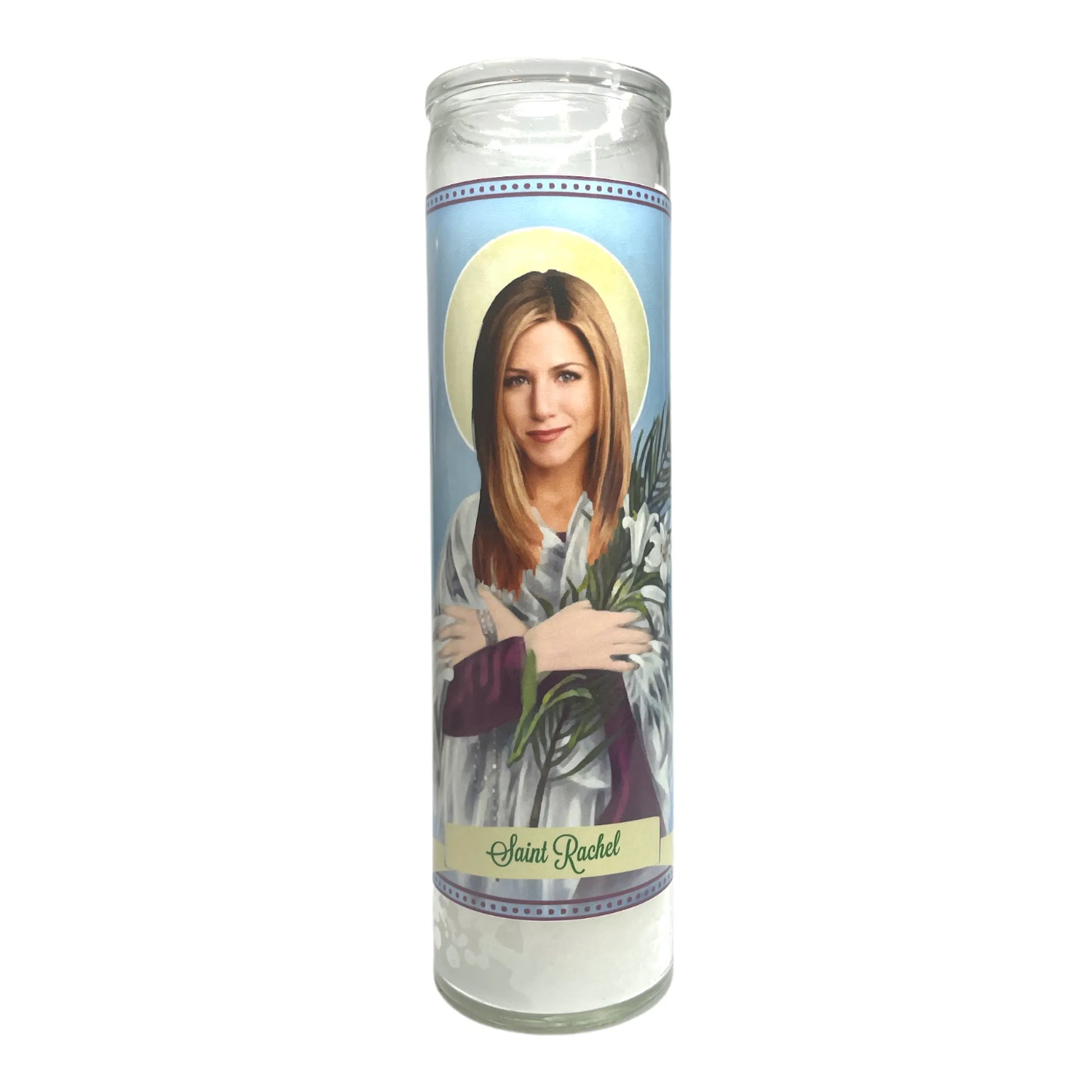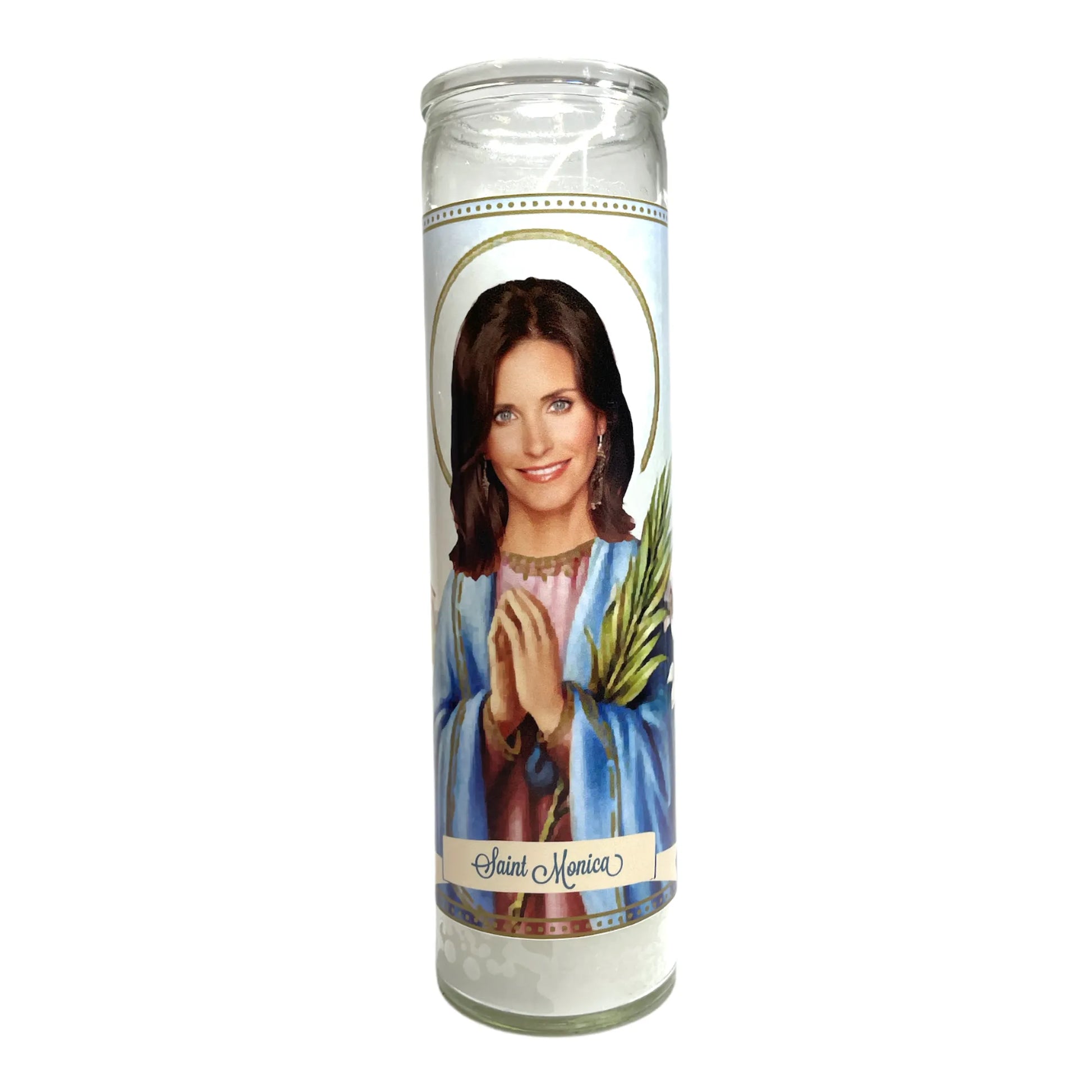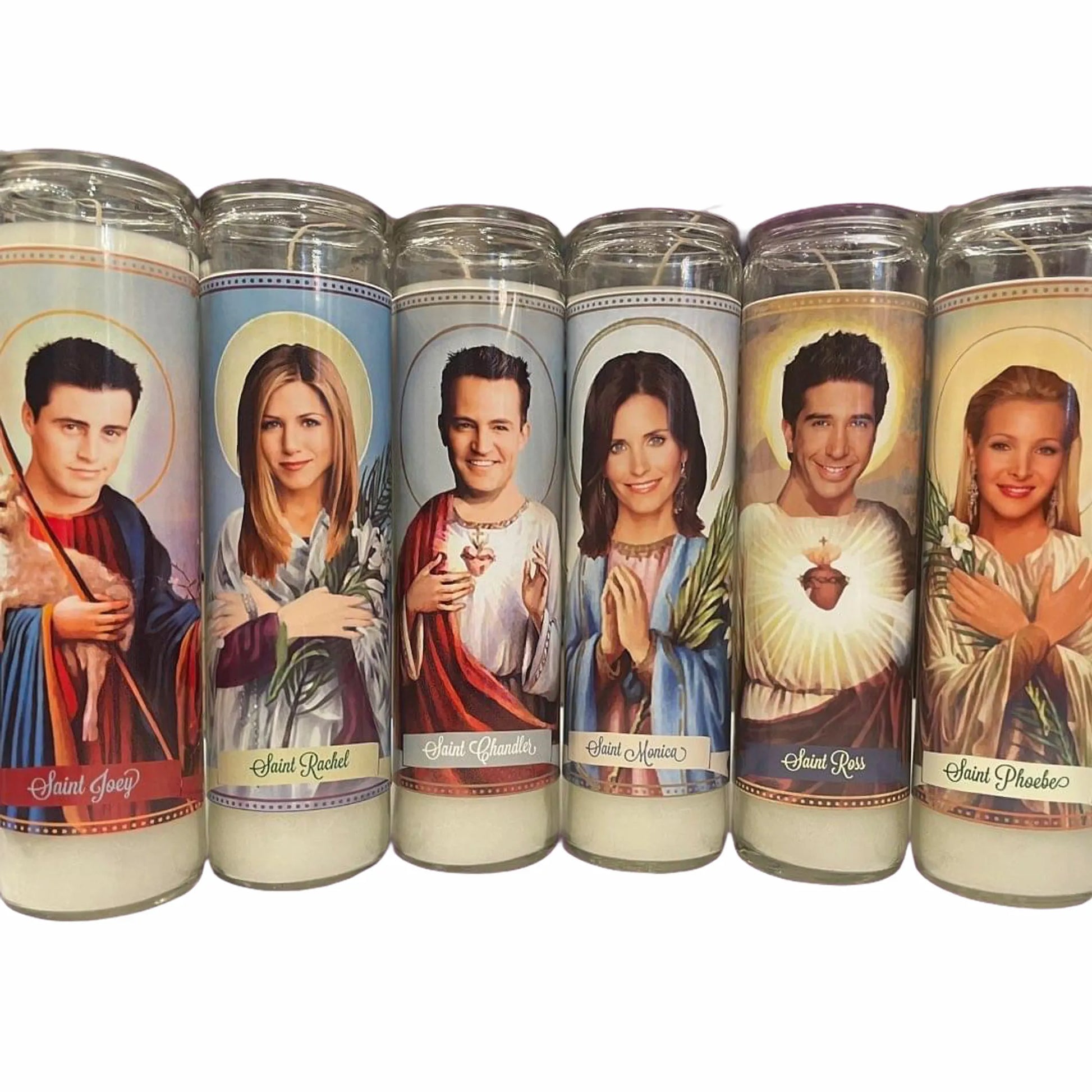 Tall white altar/ prayer candle featuring the Patron Saint of Friends.