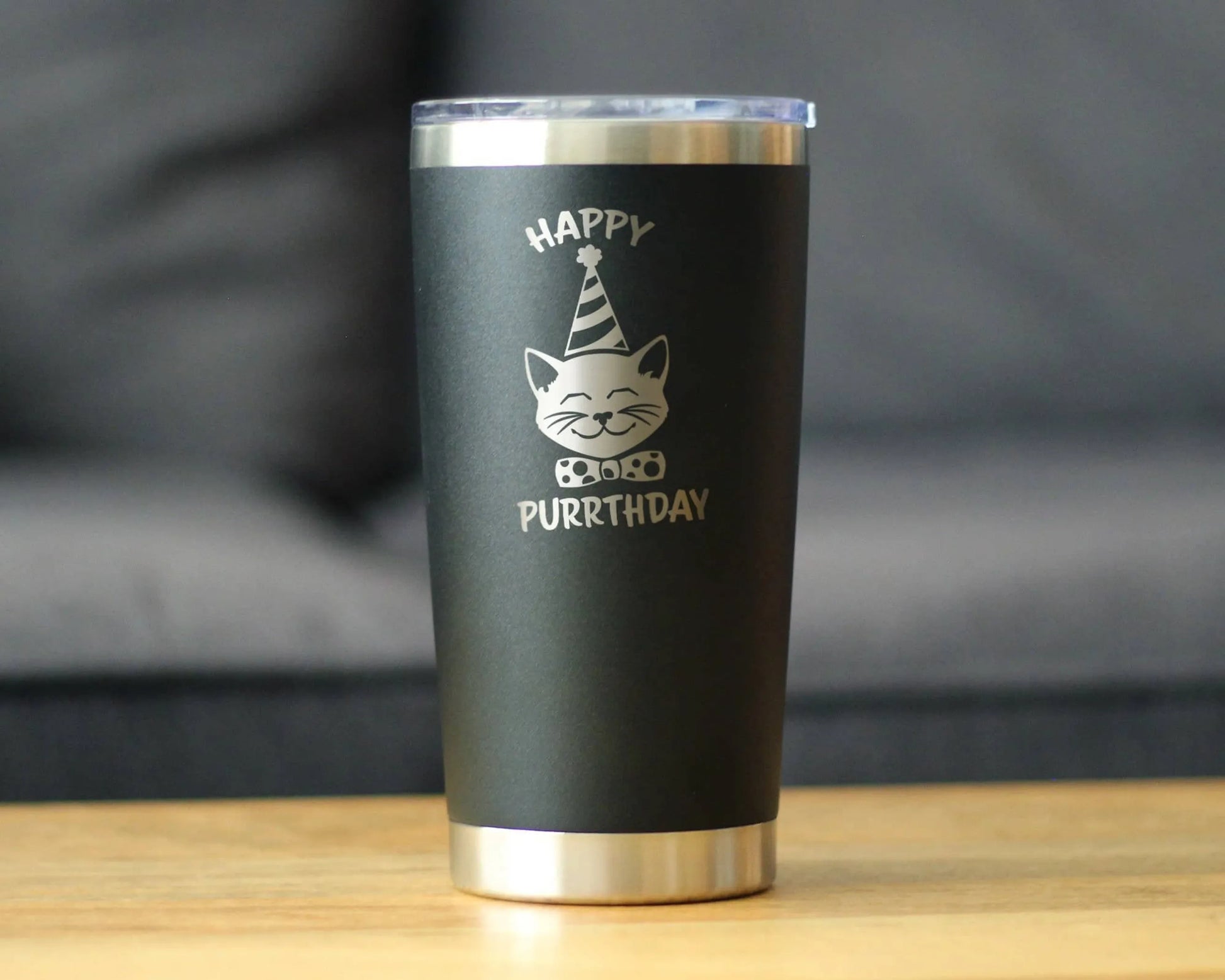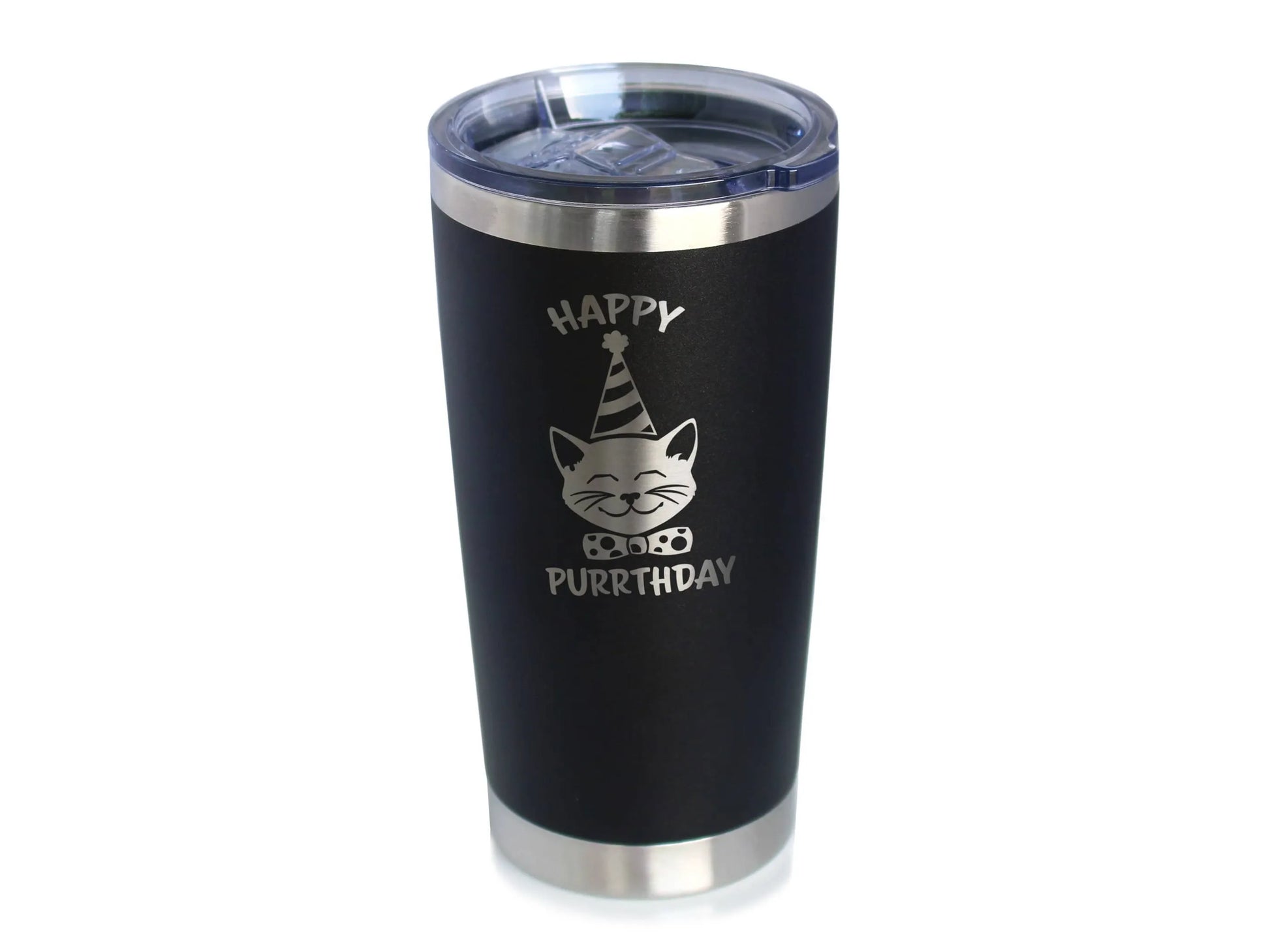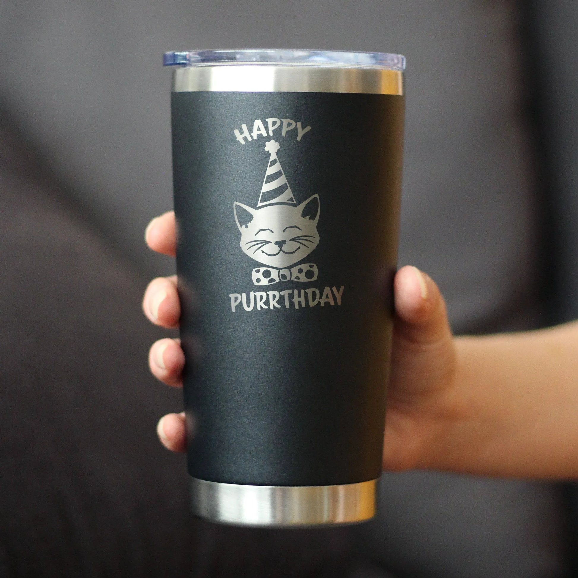 Happy Purrthday - Insulated Coffee Tumbler Cup with Sliding Lid - Stainless Steel Travel Mug - Unique Cat Birthday Gifts for Women and Men