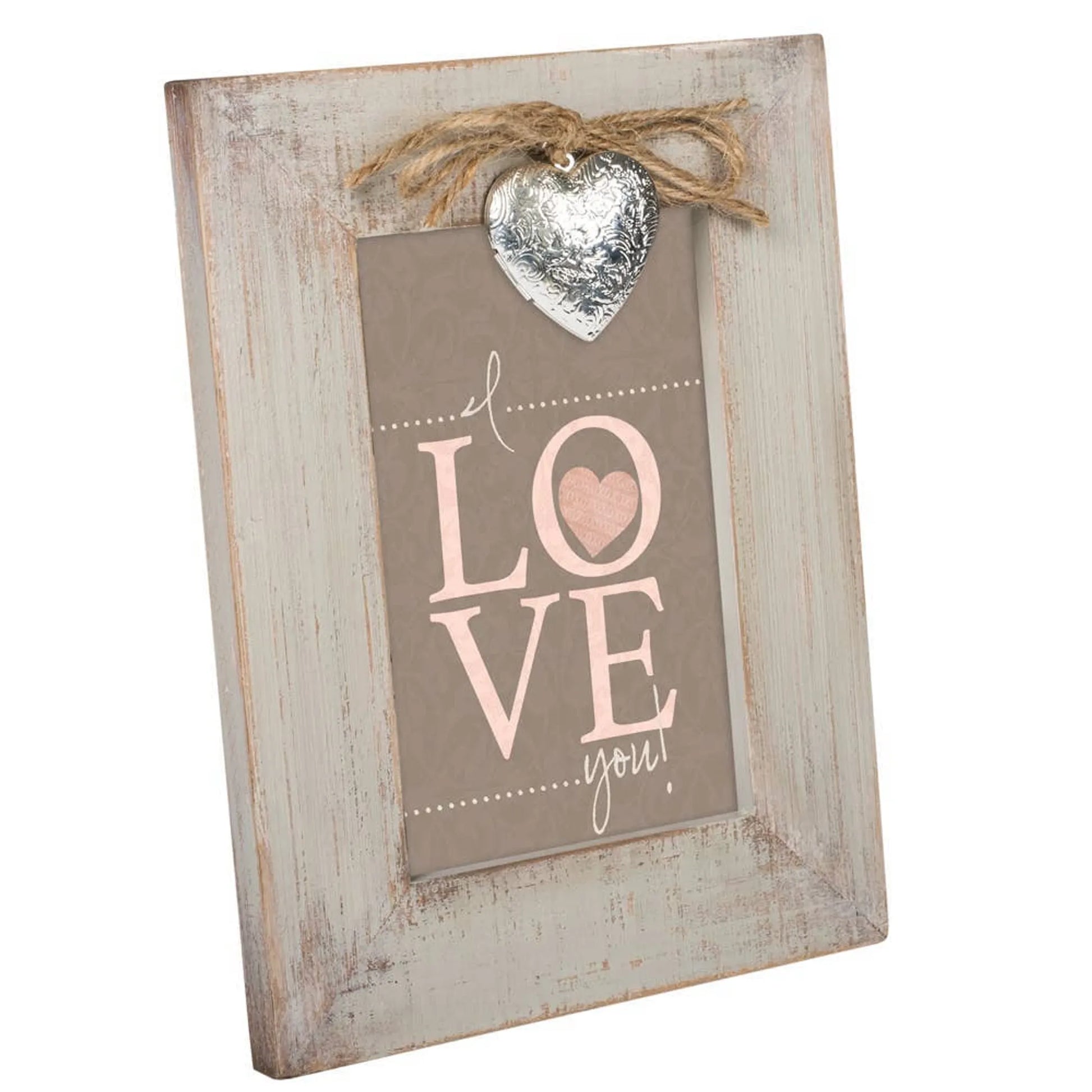 The frame in a natural finish and features a scroll patterned heart-shaped silver tone locket to keep a treasured photo or keepsake.