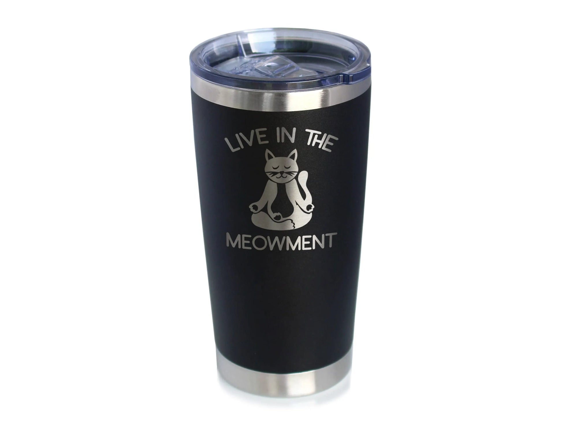 Live in the Meowment - Cat Insulated Coffee Tumbler Cup with Sliding Lid - Stainless Steel Travel Mug - Unique Yoga Gift for Women and Men