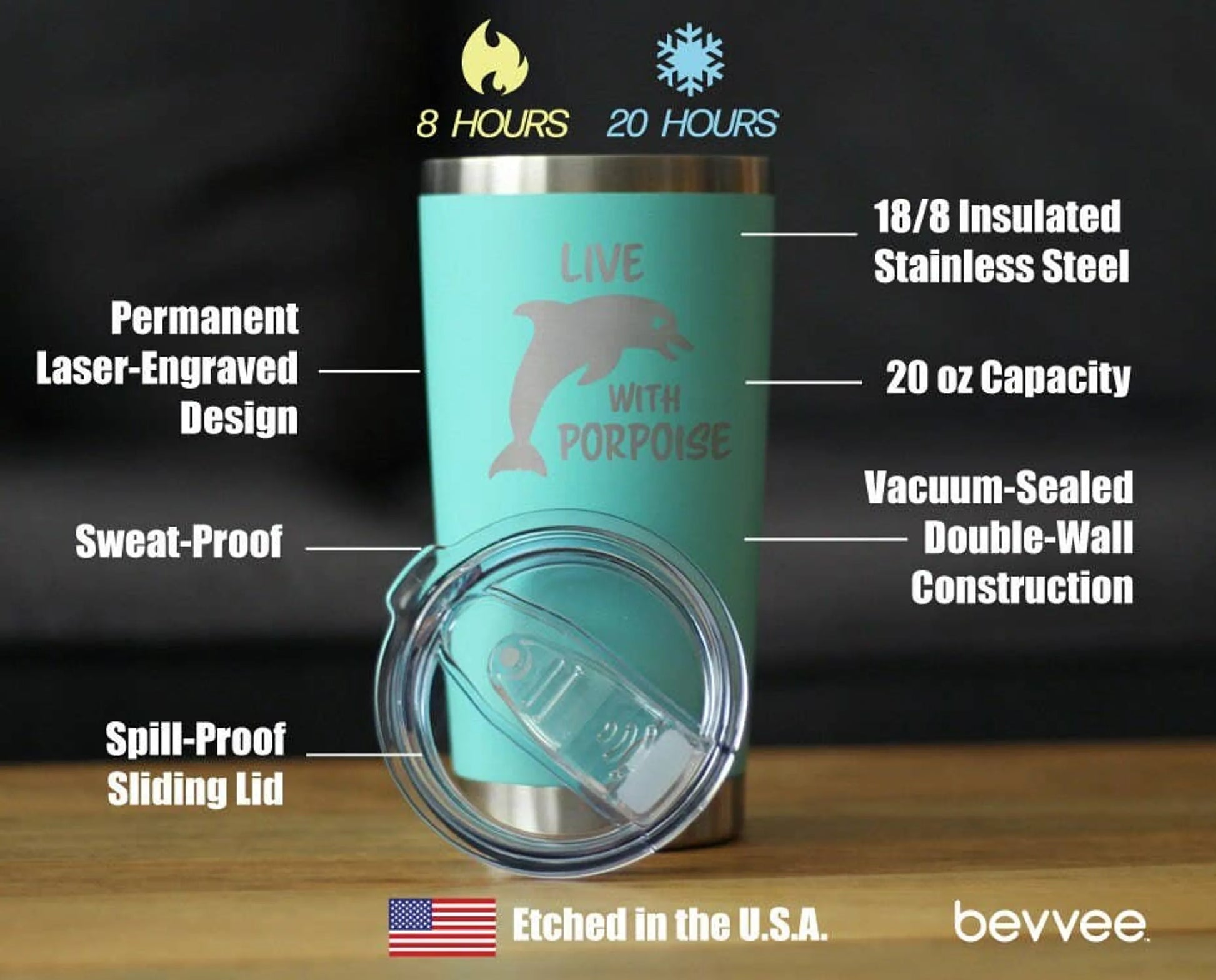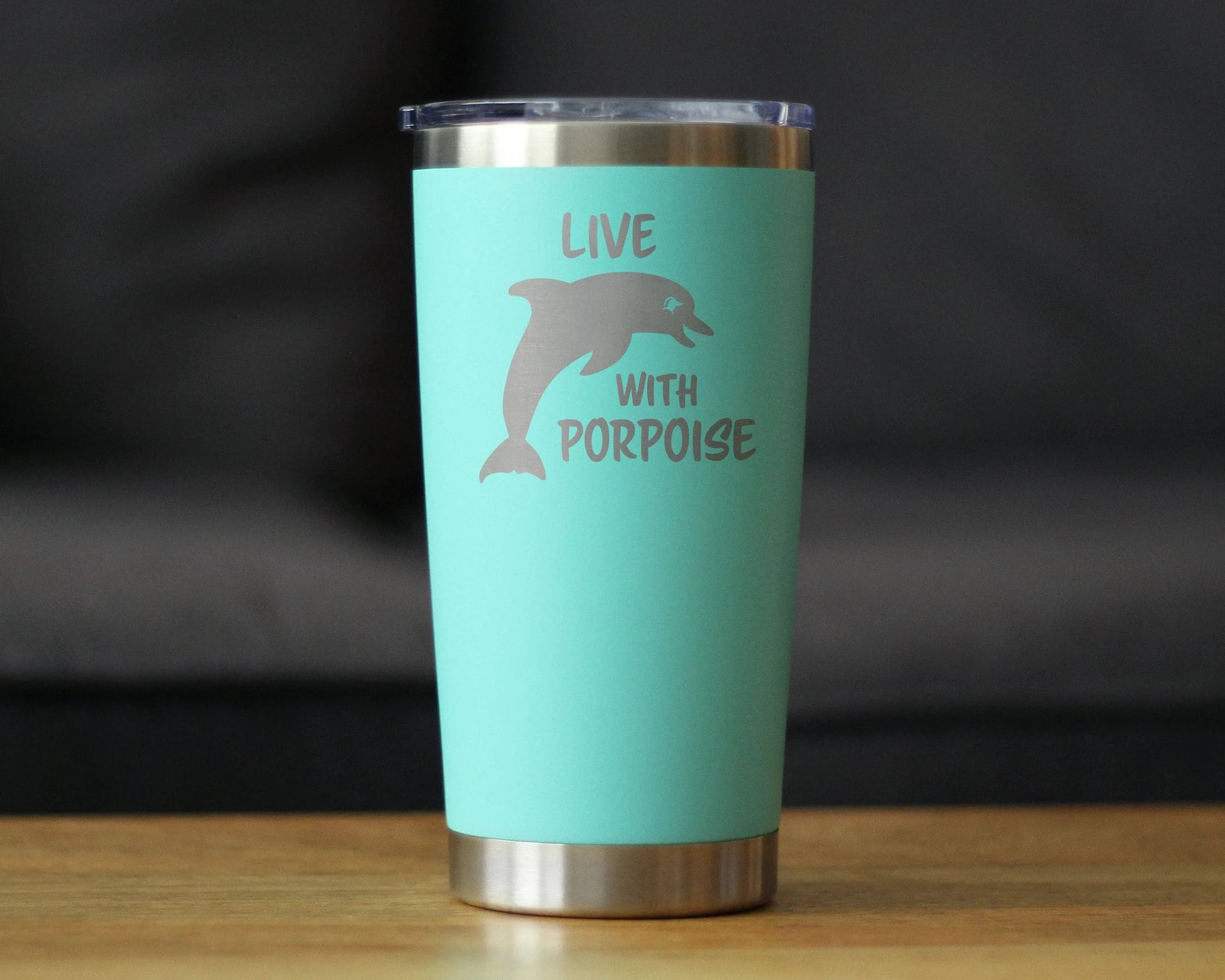 Insulated Coffee Tumbler Cup with Sliding Lid - Live with Porpoise - 20 oz - Dolphin Decor Gifts for Dolphin Lovers and Pun Lovers