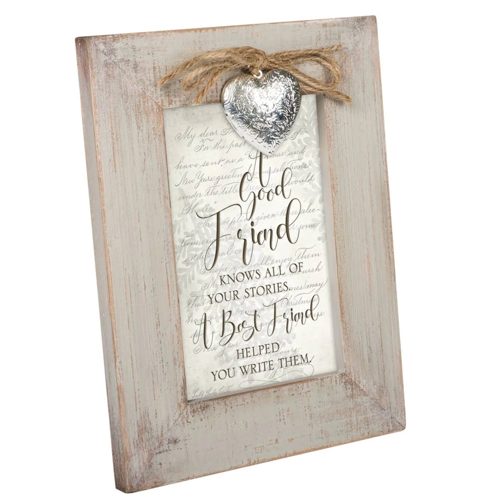 The frame is in a natural distressed finish and features a scroll patterned heart-shaped silver tone locket to keep a treasured photo or keepsake.